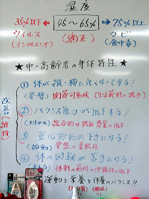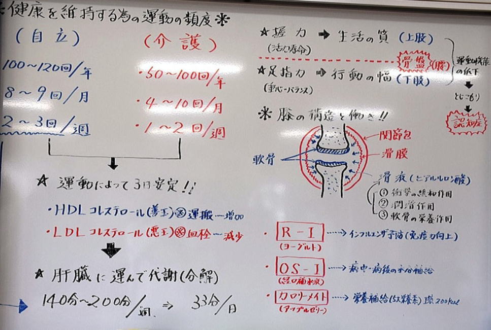 世話役の吾郷さんの司会で、西田幹事の挨拶に続き、村上先生の講義を聞きました。健康維持に必要な運動の回数は、週2~3回(140~200分程度)、例として歩行では50~75cmメートルの歩幅(時速4~6km)で、1~3km、大きく手を振り速足で歩くことが重要。しっかり運動することでHDL(善玉)が増加、LDL(悪玉)を肝臓に運ぶ能力が上昇し、血栓を減少させることができるとのこと。1日当たり30分前後の運動で十分健康維持が可能とのことでした。講義の後は、早速椅子に着席した状態での健康体操がスタートしました。全身を使い、腕や足をシンクロさせながらの運動で錆びつつある五感の改善方法も経験しました。体操は30分程度でしたが、息が上がった方もちらほら。運動継続の大切さを学んだ1日でした。開催に尽力された吾郷さん平野さんに感謝致します。