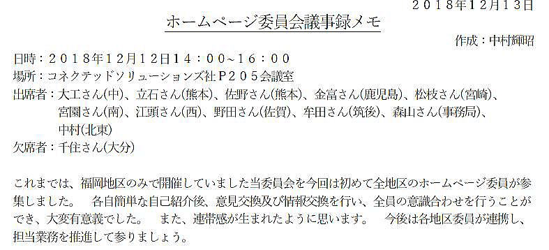 松九会各地区幹事及び地区委員の年末の定期会議に合わせ、ホームページ担当者会議が本社会議室(2部屋)にて開催され、熊本からは福村幹事と、HP会議には担当の立石と佐野さんが参加しました。会議終了後会場を移し、合同で忘年懇親会が開催されました。T&Sは帰宅しました。