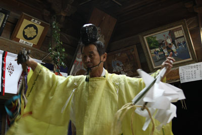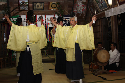 玉名地区には、いくつかの伝統的な神楽が残っています。会員の前田保さんは、その中のひとつ、玉名市豊水地区に残る「川島神楽」の舞い手として、また、保存活動にも尽力されています。川島神楽の歴史は17世紀後半に形作られた「肥後神楽」の系統に属するもので、明治の中ごろに川島地区に普及されたとされております。伝承にも力を入れておられ、子供神楽の指導、全国での神楽フェスティバル等への参加、玉名近郊での催しへの参加もされています。定期的には、10月の川島天満宮、北八幡宮(伊倉)での奉納を中心に、年8回程の奉納を行われています。