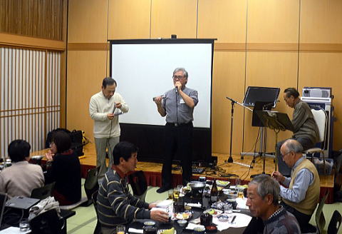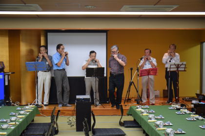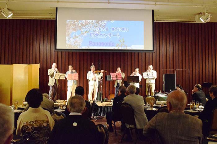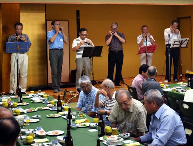 メンバーが7名となり練習の成果も披露したいと4曲演奏しました。懇親会開始にあわせ、バラが咲いた、スワニー川、琵琶湖周航の歌を披露。大人数で演奏するのは初めてで、モニター装置も持っていなかったので、自分自身の演奏音が聞き取りにくい難しさもありましたが、ほとんどの方が楽譜を見らずに演奏されており、新しい課題は見えてきたものの、各位の頑張りが目立つ演奏会だと思いました。いつものように最後に故郷を9月から参加の野尻さんも入り7名で演奏し、懇親会参加者全員で合唱しました。