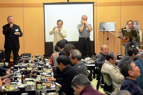 12月17日:熊本地区の労使招待での忘年懇親会が開催されました。懇親会を盛り上げること、音楽愛好者を広く募集することを目指して、徳丸さんによるギター演奏・と歌唱(白いブランコ)、及びギター伴奏と江見さん、立石さんによるハーモニカ演奏での全員による「故郷」を合唱しました。徳丸さんも立石さんも30数年ぶりに演奏するということで、音楽愛好会推進担当の江見さんの協力を得て、2週間余り特訓をしてきました。江見さんは通常はバイオリン奏者ですが、特別にハーモニカを購入し、ゼロから練習されました。この三人で当日演奏会を開きました。宴会たけなわでしたが、参加者の皆さんも大きな声で合唱し、楽しいひと時を過ごすことが出来ました。ハーモニカ演奏が間に合わなかった平野さんは歌で頑張り、西田幹事は演奏者の紹介と、自身も「故郷」を大きな声で歌われました。決して音痴ではありません。今後は野尻さんのバイオリン挑戦、立石さんのクロマチックハーモニカへの脱皮、平野さんのハーモニカへの継続しての挑戦等々、大いに楽しみです。