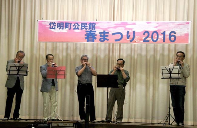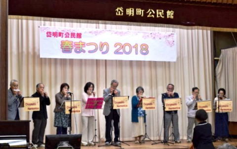4月10日岱明町公民館春まつりが開催され、公民館講座でハーモニカ講師の江見さんとおタマナじゃくしのメンバー4名で演奏しました。