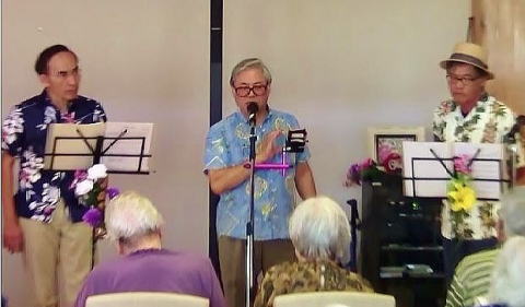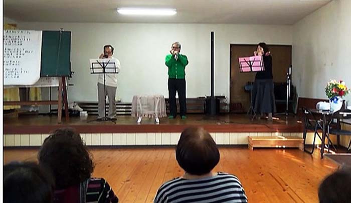 岱明町中央公民館ハーモニカ教室メンバーの中山さんが、企画・推進中の「牛水中区いきいきサロン」会場(公民館)で、ハーモニカとヴァイオリンのコンサートを中山さん主催で、江見さん、立石 の三名で行いました。会場にはサロン責任者や区長さん、準備委員、招待者の方々が40名前後出席されました。まず中山さんの挨拶に続き、「夕焼け小焼け」の演奏からスタートしました。出席者の皆さんは演奏に合わせ元気に歌っていただきました。次に「