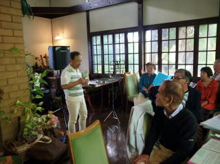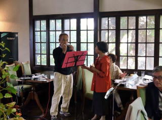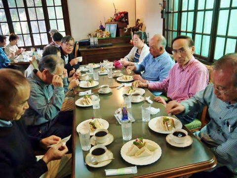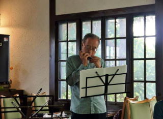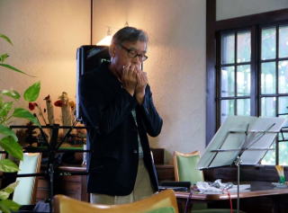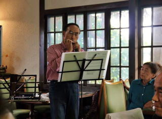 10月12日(水)公民館でのクロマチックハーモニカ講座終了後会場を南荒尾のペンション「音羽の森」に移し、ハーモニカの「吹きまくり会」を開催しました。まず美味しい特製サンドイッチとコーヒーで食事をした後、各自好きな曲を演奏し、中島・清水両先生と受講生の皆さんで披露し合いました。 まず最初に清水先生とメンバー3名で演奏し、その後一番先に手を挙げた次郎丸さん、次に岡部さん、立石、徳丸さん、平野さん、角田さんが挑戦し受講生のしんがりに江見さんが「夕焼け小焼け」を、情緒豊かに演奏しました。最後に清水先生と、中島先生が、デュエット及びそれぞれソロで5曲演奏されました。11時40分から14時15分頃迄レストランは貸切だったので、思う存分楽しむことが出来、本当に有意義なひと時でした。今後も機会を作り「吹きまくり会」を実施したいと、皆さんそれぞれ言っていました。