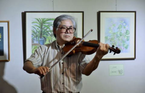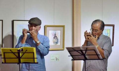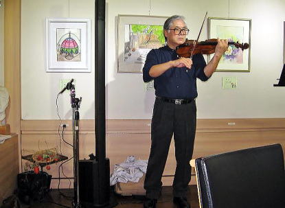 水彩画展示会を開催中の「画廊中川」(玉名市)にて、10月21日午後、画廊 門下生の平野さん主催のコンサートが開催されました。江見さんがヴァイオリンで、シューベルトやドボールザーク作品など多数のクラシックと懐かしい歌謡曲、童謡等を演奏し、会場いっぱいのお客様より大きな拍手を頂きました。その合間に平野、今村、江見、立石の四名でクロマチックハーモニカ演奏をしました。曲は、「バラが咲いた」「夕焼け小焼け」「上を向いて歩こう」「ふるさと」の4曲でした。会場の約40名のお客様が大きな声で合唱され、大いに盛り上がりました。最後にも、ヴァイオリンとハーモニカのコラボで「ふるさと」を演奏し、一層大きな歌声がこだましました。もっともっとハーモニカに習熟すると共に、音楽の深さにも触れていけたらと感じたコンサートでした。