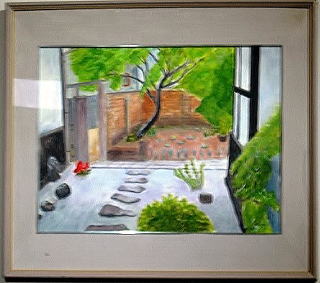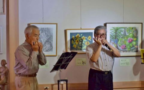 玉名市岱明町公民館の絵画教室作品展会開催中の玉名市の「画廊中川」において、10月20日にハーモニカ&ヴァイオリンコンサートを開催しました。絵画教室主催者で、おタマナじゃくしメンバーでもある平野正弘さんの挨拶の後、われら“おタマナじゃくしと仲間達”(角田・江見・野尻・平野)で演奏しました。第一ステージは子供達が良く知っている曲(にじ、365日の紙飛行機、ふるさと、ドラえもん)を演奏し、第二ステージは、江見さんのヴァイオリン独奏9曲、そして最後にふるさとを、ヴァイオリンとハーモニカで合奏、画廊会員及び観客の皆さんもいっしょに歌い大いに楽しんでいただきました。この展示会には平野さんが時間をかけて描いた絵も展示されています。画廊でコンサートなんて、洒落てると思いませんか?
