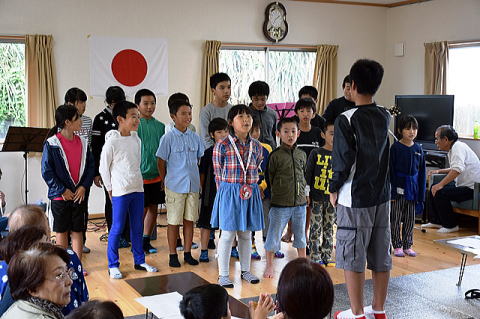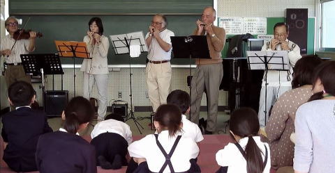 今回は15時過ぎより“おタマナじゃくしと仲間達”5名(P-OB4名)で、睦合小学校の音楽教室での演奏の準備していると、早速子供達が入室してきたので、リハーサルの間もなく演奏をスタートしました。子供達が良く知っている「始めの一歩」、「にじ」に続き「情熱大陸」、「365日の紙飛行機」、「ドラえもん」、「ふるさと」を一挙に演奏しました。子供たちが元気に歌うので勢いに任せて演奏した結果、45分の予定時間が30分で終ったので、「森のくまさん」を追加演奏しました。子供達が興味を示したので三回繰り返しました。非常にテンポが早い曲の為汗をかくほどでしたが、子供たちの元気いっぱいの歌声で、楽しく過ごすことが出来ました。睦合小学校は私の家から100メートルほどの近くです。今回で2回目ですが、小学校低学年の放課後教育(むつみ教室)を、今後も応援していきたいと感じたひと時でした。