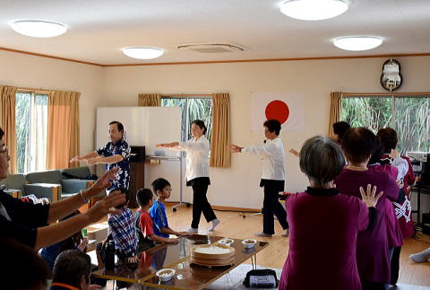 音楽を楽しむ会「おタマナじゃくし」のメンバー4名が、玉名市内の神社の秋祭りでハーモニカ演奏をしました。当日の10月23日は前日からの雨が止まず、会場が交流館になりました。消防団訓練や子供会の合唱等の後、5番目に出演しました。まずイントロで「村祭り」、次に「バラが咲いた」「上を向いて歩こう」「夕焼け小焼け」、最後に「故郷」を演奏しました。ハーモニカ教室の先生の紹介や半音を出せるクロマチックハーモニカは、1台で全部の曲を演奏できること等の説明をしました。演奏中は手拍子や歌声も聞こえ、和やかに演奏を進めることが出来ました。演奏終了後は、加茂さん角田さんが用事で帰宅、江見さんと立石は、年配の方々の懐かしい歌や踊りに参加し、地域の方々との楽しいひと時を送りました。クロマチックハーモニカへの質問に江見さんが易しく回答したので、愛好者が増えるのではないかと期待しています。なお、おタマナじゃくしの名前の由来についても説明し、興味を持っていただいたようです。