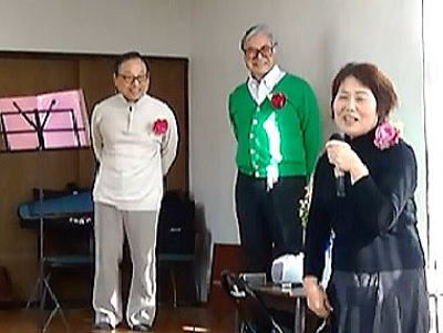 上を向いて歩こう」「荒城の月」「アメイジンググレイス」「千の風になって」「月の沙漠」と続き熊本地震で見直されている「花は咲く」を演奏し、中山さんのソロで「ゴッドファザー」を最後に演奏しました。次に第二幕として、江見さんによるヴァイオリンにてクラシックから童謡のメドレー迄演奏し、皆さん熱心に聞き入っておられました。ヴァイオリンの演奏が終わると最後に三人で「故郷」をハーモニカで演奏し出席者の皆さんも大きな声で合唱されました。