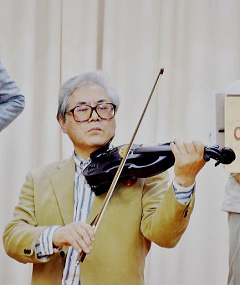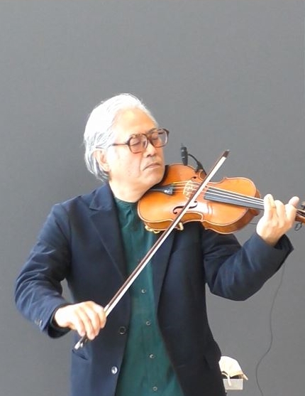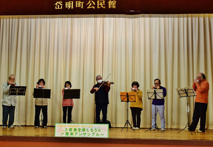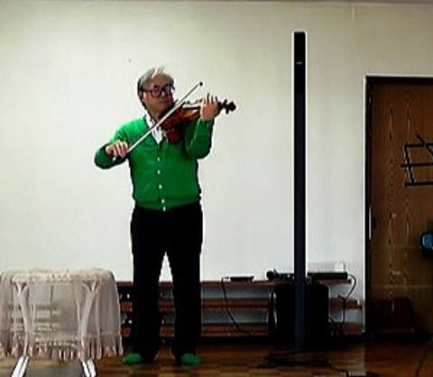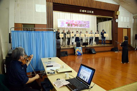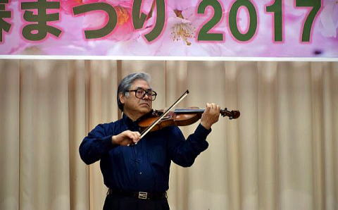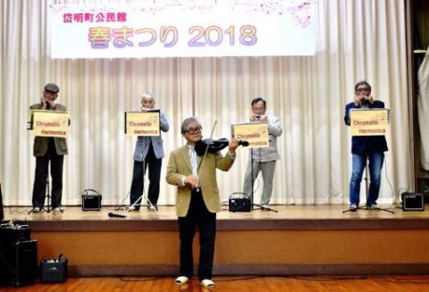 岱明町公民館春まつりでハーモニカとヴァイオリンを演奏