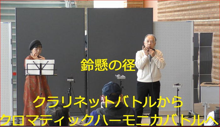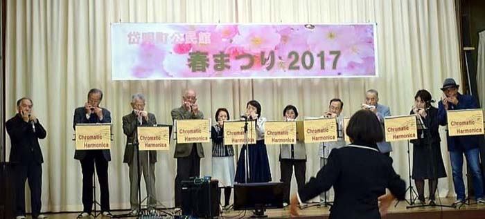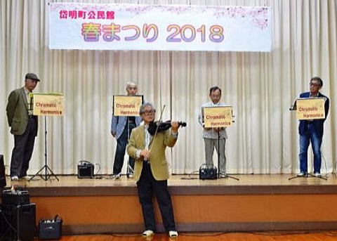 3月19日岱明町公民館で第3回の春まつりが開催され、クロマチックハーモニカの部門には中島、清水の両先生を含め12名が出演しました。江見さんは本部席よりヴァイオリンでコラボ演奏を披露しました。演奏曲は“星の星座、ちょうちょ、巣立ちの歌、森のくまさん”、そして“ふるさと”でした。今回の特徴は2重奏や3重奏に早いテンポの曲、更にアドリブが加わり、幅広く重層的なメロディーを表現できたのではないかと思います。