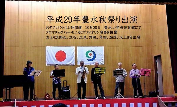 10月28日の豊水秋祭りに出演し、子供たちが良く知っている「にじ」、「365日の紙飛行機」をまず演奏しました。次に“おタマナじゃくしと仲間達”のシニアエネルギーを表現する為に、葉加瀬太郎作曲の「情熱大陸」を、ハーモニカとヴァイオリンの合奏で披露しました。ハウリングの問題で絞り気味のアンプのVRを補うように力いっぱい演奏した結果、かなりの拍手を頂きました。ハーモニカの最後の曲は“皆さんに歌っていただく為に、誰もが良く知っている「ふるさと」を主メロディー・低音域・アドリブ等を加えて演奏しました。持ち時間が20分だったので、江見さんのヴァイオリンは2曲しか演奏できませんでしたが、それぞれの楽器の特徴と音色を楽しんでいただけたかなと感じた演奏でした。