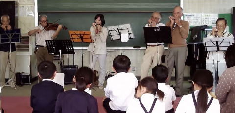 むつみ教室マネージャーの今村さん(ハーモニカメンバー)に協力し、睦合小学校一~二年生の児童を対象に岱明町公民館講座器楽演奏教室:通称「おタマナじゃくしと仲間達」7名で、江見さん指揮の元、ヴァイオリンとクロマチックハーモニカの演奏を行いました。15:00~約1時間15分ほどの演奏でしたが、子供達が良く知っている曲ばかりだったので元気よく歌ってくれました。10曲を超す曲数でしたが、子供たちの元気に負けない様演奏しました。終了時は子供達全員と再会を約束し、ハイタッチをして別れました。