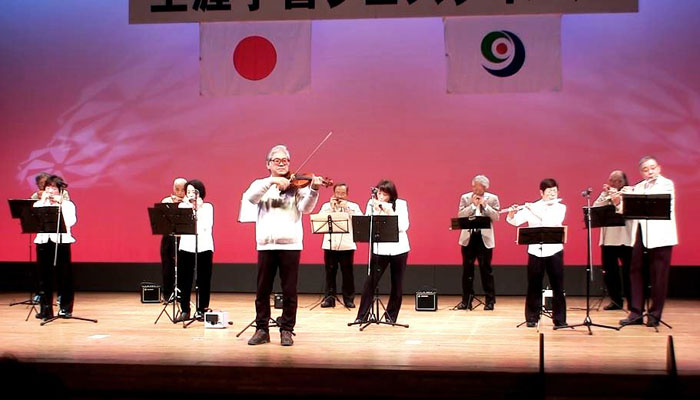 2017年6月~スタートした、楽器に制限のない音楽を楽しむ講座です。講師は熊本地区OBの江見さんです。参加者はOB5名と一般の方々2名で練習をしています。昼間時間がない方々が多いことから、19時~21時の時間帯で、岱明町公民館で自由講座としてスタートしました。毎月2回練習を行っていますが、その間地域の小学校でヴァイオリンとハーモニカの演奏を子供たちに披露したり、色々な施設での慰問演奏等も計画中です。尚演奏する楽器に制限はなく、新たにヴァイオリンを始める人も出て来ています。今後多彩な楽器での演奏ができるようになるかもしれません。楽しんで音楽に浸っていきます。