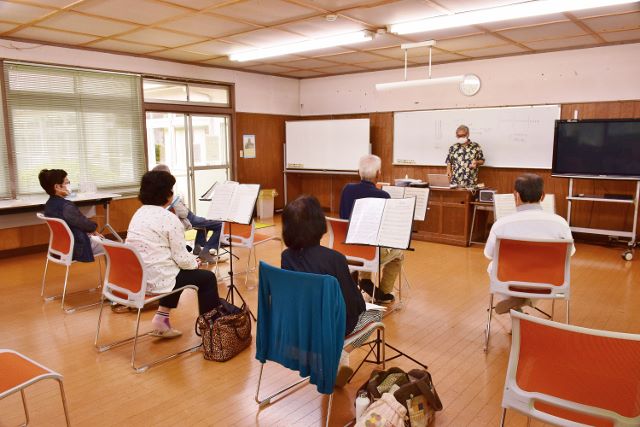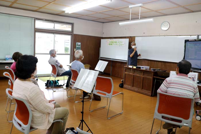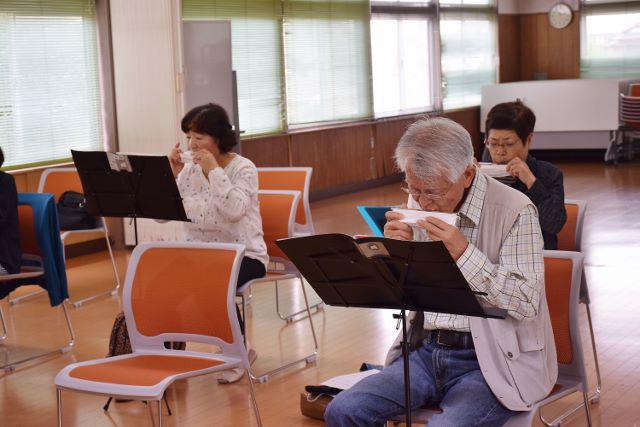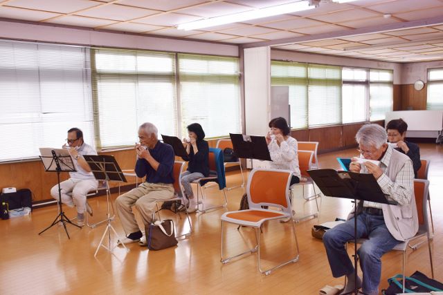 異常気象に加えて新型コロナ感染拡大と地球規模での危機に立たされています。音楽会も制約される中、私たちは「音楽を楽しむ会」通称:おタマナじゃくしと仲間達の活動を続けています。飛沫抑止のハーモニカ専用マスクを装着し、三密対策や教室の換気にも注意を払って練習に励んでいます。七月には新年度の開講式を行い、新たに一名の受講者を加えて活動を拡げています。講師は経験豊富なバイオリン奏者の江見さんにお願いし、音楽の基礎から学べる場にもなっています。まず正確な演奏ができること、楽器の持ち方やくわえ方、体の姿勢など初心者にも対応した指導がなされています。生涯学習としての来年2月の発表会を目標に楽曲もなじみのあるやさしい曲からハイレベルの曲まで幅広く選曲しています。ハーモニカ教室は第1週と第3週(水曜日)10時からお昼迄です。訪問をお待ちしています。