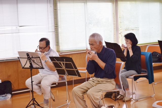 新型コロナ感染防止の為、活動休止中だった「音楽を楽しむ会」通称:おタマナじゃくしと仲間達を、9月より再開でき三密を避けながら練習に励んでいます。飛沫抑止のハーモニカ専用マスクを考案し、施設の承認を得て、全員マスクを装着したハーモニカで演奏を楽しんでいます。