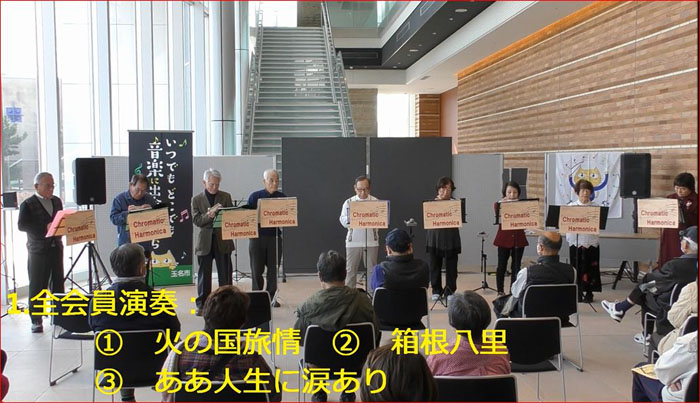 クロマチックハーモニカの広い音域を生かして、2重奏・3重奏に挑戦し、幅が広く且つ深いハーモニーを披露することができました。1曲目の「ちょうちょ」2重奏は少し同期(シンクロ)が乱れたものの、2曲目の「巣立ち」3重奏 で徐々に調子を上げ、3曲目のアップテンポの「森のくまさん」2重奏では、1st・2nd同時演奏の「アドリブ」部分は超特急のテンポでしたが、うまく乗り切って、最後の「ふるさと」3重奏は、「アドリブ」も全員演奏し、3オクターブの広い音域と深みを表現し、今までにない「ふるさと」を観客の皆さんに披露することが出来たのではないかと思います。演奏後、打ち上げ懇親会を定食処「いつものところ」で開催し、大いに楽しみました。