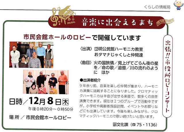 12月8日(木)玉名市民会館ホールロビーにて、OB会員主催のクロマティックハーモニカコンサートを、会員9名及び、応援のヴァイオリン奏者・江見さん、ハーモニカ講師の中島及び清水両先生の参加で開催しました。