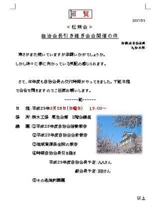 今回は受講者3名で講師を含めても5名と参加者が少なかったが、ワードを使っての連絡書や案内書等の作成方法を学びました。野尻さんが準備した“回覧(連絡書)”の見本を使い、文書の作成から配置の方法更に写真の挿入等を学習しましや。ワードは標準文字数や標準行数等で作成する場合は、初心者でも何とか使えますが、自分なりにカスタマイズした様式に仕上げようとすると、設定が煩雑となり使いにくくなってきます。次回はワードの基礎を続けて学習し、設定方法などを含めて目的の書式が出来るように学習します。4月は休みます。