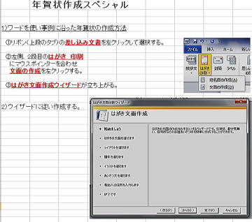 平成28年12月15日今年最後のパソコン教室を開催しました。年末懇親会の翌日でしたが、参加者の皆さんのやる気が伝わってきて、講師陣も気を引き締めて講義を行いました。ワードでの住所録作成の復習の後、実際にワード画面で右の事例の様に、文章や画像の配置と形状の加工などを学習しました。今回は講師を含め8名でしたが、ワード、ペイント、画面プリント、PNGやBMPからjpeg形式への変換も試しました。皆さん来年の元旦に届くように頑張って作成してください。尚今回は画像処理をメインに進めましたが、次回(1月以降)は、パソコンをうまく使いこなすために、作成ファイルの整理や管理方法等を、改めて学習することにしました。日程は後日連絡します。