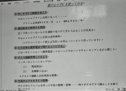 ワード紙面上へのテキスト文章の配置や文字間寸法の微調整、その中への写真やイラストの挿入と配置の調整まで講義を終えた段階で、年末を迎えTV番組などの録画や再生についての各種規格、DVD・Bluelayディスクでカバーできる映像と録画再生機器について説明を行いました。最後に来年度のパソコン教室の予定を2月の第三木曜日に設定し解散しました。次回は和室となる予定です。