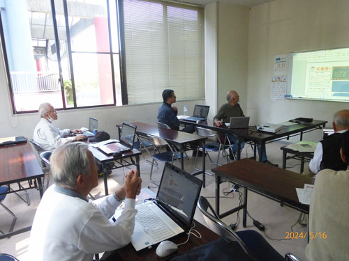 5月17日第20回パソコン教室を、9名の参加でいつもの勤労青少年ホーム会議室にて開催しました。