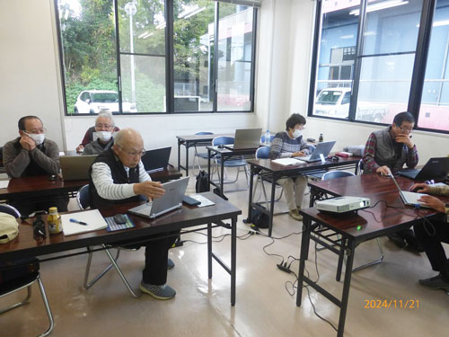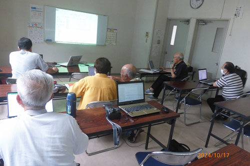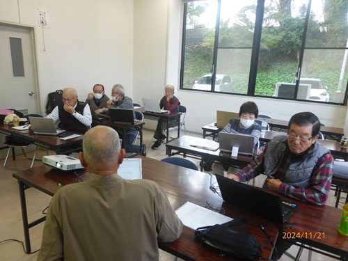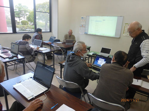 第14回のパソコン教室を、第3木曜日の19日に開催しました。足を痛めている人は、和室なので座椅子持参が必要でしたが、11月度からは会議室が確保でき、座り受講は回避できそうです。