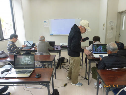 パソコンを活用して様々な資料や写真などを作成していると、新旧及び各種ファイルの中から必要なファイルを探し出すのが面倒になってきます。そこで今回は時系列に沿った検索や、各種ファイル別に把握しやすくする方法等を学習しました。講師は野尻さん、立石は弔事で欠席、参加者は講師を含め7名でした。