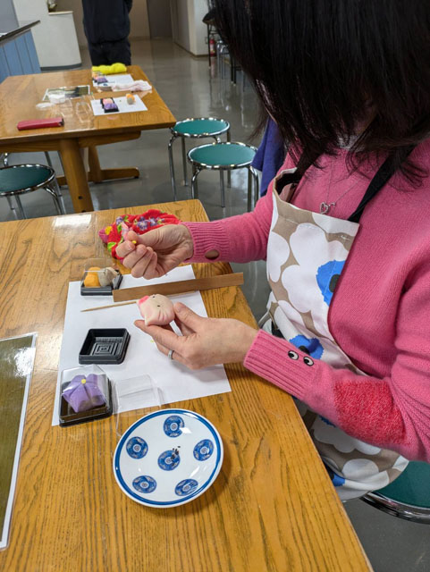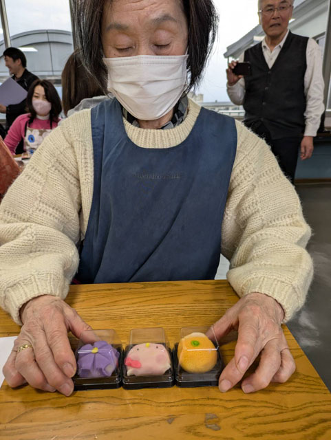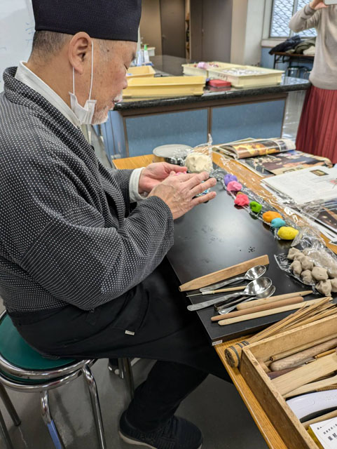 本日の講師は熊本市川尻地区にある創業120年老舗和菓子店 菓匠たてやま 三代目の立山さんです。立山さんは全国的に有名な工芸菓子職人で、県内外からその技術を求め訪れる職人さんも多いそうです。『順に、順に、手を加えながら、素材を生かす味を追求している』と言う立山さんが作る和菓子は、シンプルながらも口の中に含んだ瞬間、豊かな味わいが広がる逸品ばかりです。本日は9名中8名が初チャレンジで、悪戦苦闘の中、どうなるか心配でしたが先生のユーモアある指導により写真のような見事な作品が出来あがり皆さん満足しておられました。立山講師から、先週は外国人の生徒でコミュニケーションが難しかったが今日はとても楽しくやれた。また、参加者からもユーモアがあり笑いが絶えない教室で非常に楽しかったとのコメントでした。