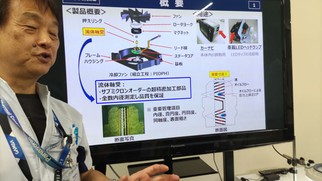 今回はメカトロ二クス事業部冷却ファン(流体軸受ファン)を見学しました。責任者の関さんよりプレゼン頂き、流軸ファンの歴史(1995年ノートPC用・2012年自動車LEDヘッドランプ用・センシングカメラ用・自動運転用LIDAR・EV用Sub DCDCコンバータ用)用途は99%車載用・世界占有率50~60%のようです。最大の特長は『独自の流体軸受けでいつまでも静かに安定した風を送り続けることができる』ということです。先進技術で安全運転を支援するスバル自動車のアイサイトに全面的に採用されているようです。