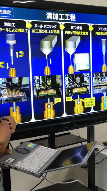 製造ノウハウは超精密加工技術(旋盤加工・溝加工)がポイントとの説明を受けました。生産拠点としては熊本工場(マザー工場/60名)とPIDPH(フイリピンカランバ/約700名)から全世界に供給されているそうです。佐賀拠点閉鎖により九州唯一の生産拠点である熊本工場には生き残りを掛けて頑張って頂きたいと思います。